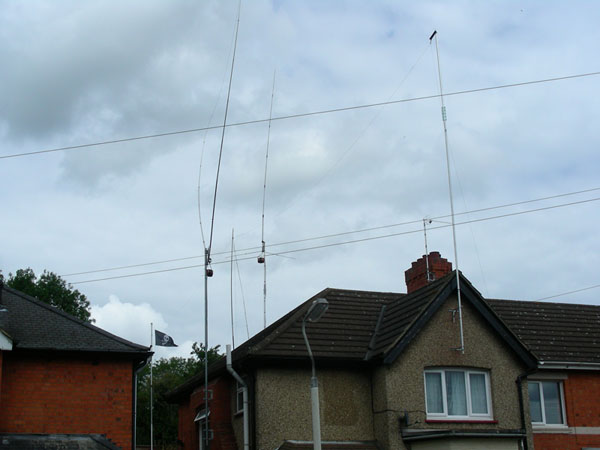 So this picture shows my house as it is now. Looking from left to right, the flagpole at the rear (with skull and crossbones flag) holds one end of the doublet, the 20m delta loop next and then the centre support for the doublet. After that comes the 10m 5/8ths wave vertical, the tv antenna and then the 10m pole for the front end of the doublet.